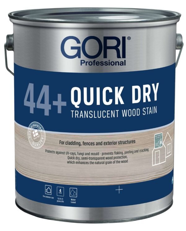 Ensure good ventilation during application and drying. Apply by brush or roller. Stir well. Do not apply when moisture of the wood is above 18% at the time of treatment or if the temperature is below +5°C and relative humidity is below 80%. Avoid application in damp conditions or externally when rain is imminent. Never apply wood protection in direct sunlight. Apply one coat of GORI 11 Wood Preservative as directed before applying two coats of GORI 44+ Quick Dry Translucent Wood Stain. Please note that the final colour result depends on the colour of the substrate. If more than one can of the same colour is to be used in the same area, intermix before use. Additional coats may be required in certain colours or when attempting a wide colour change.